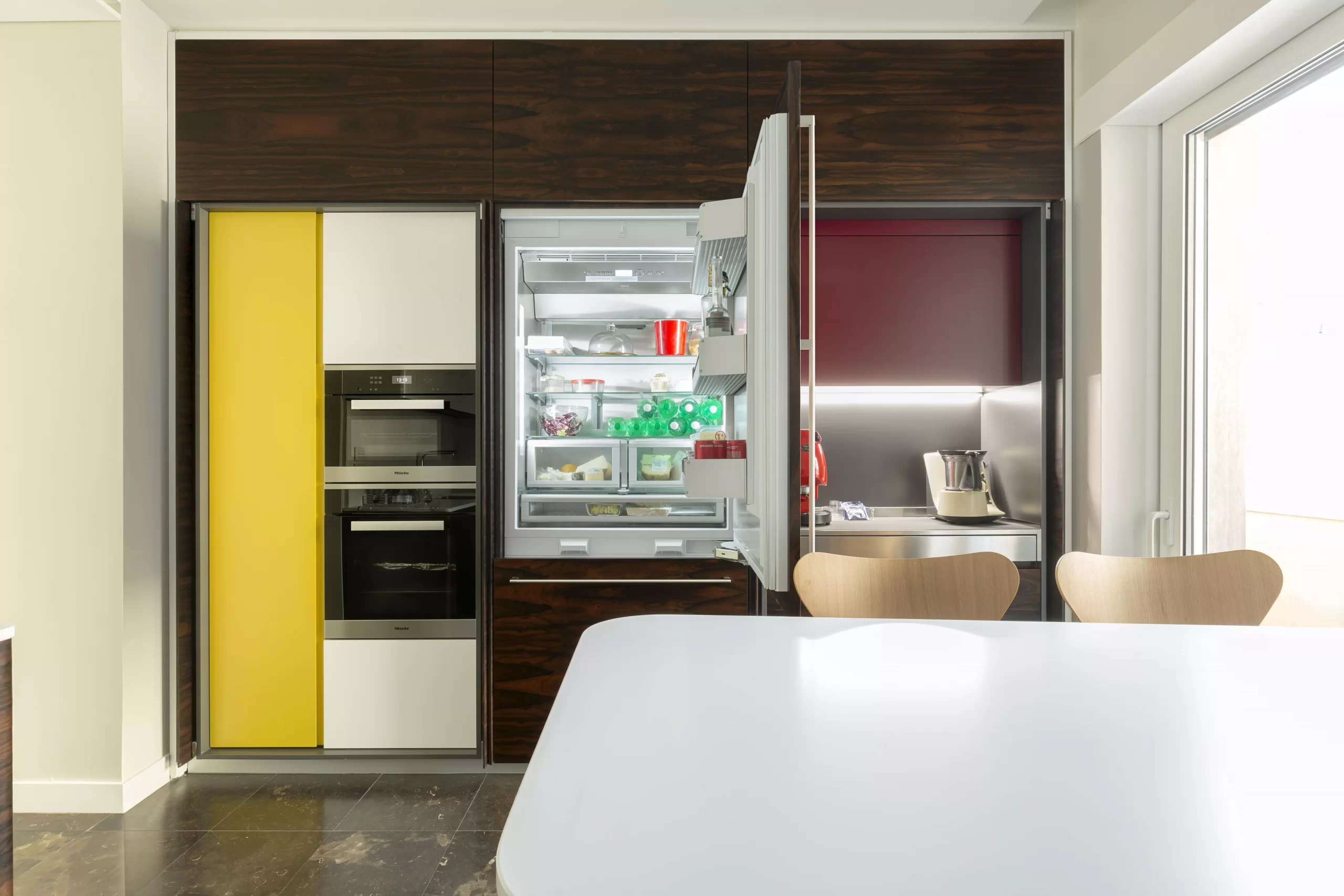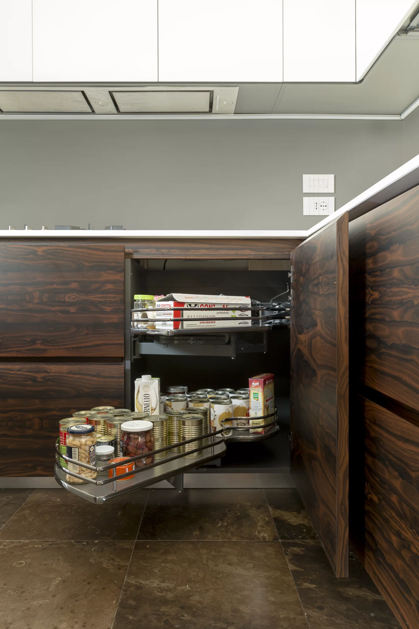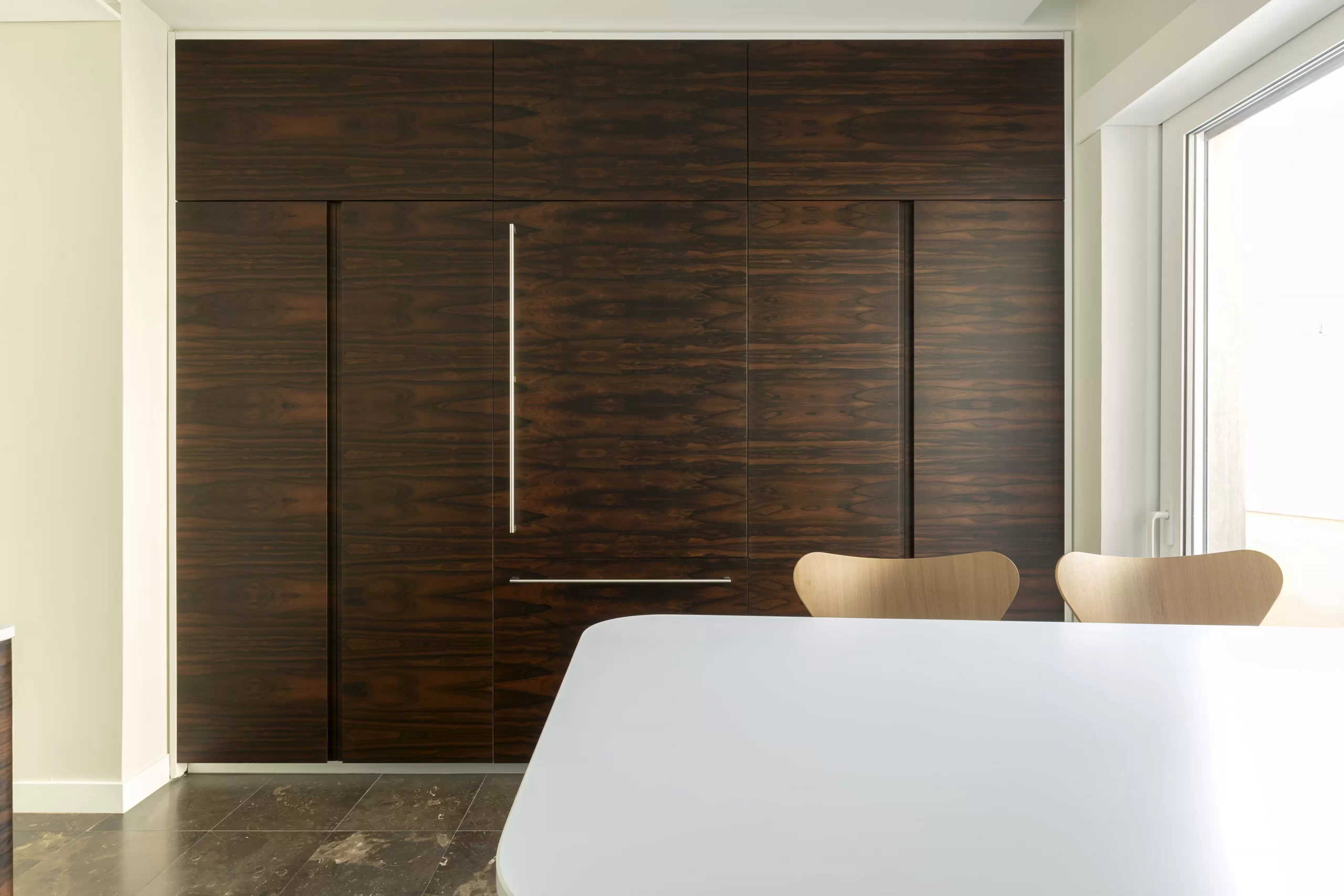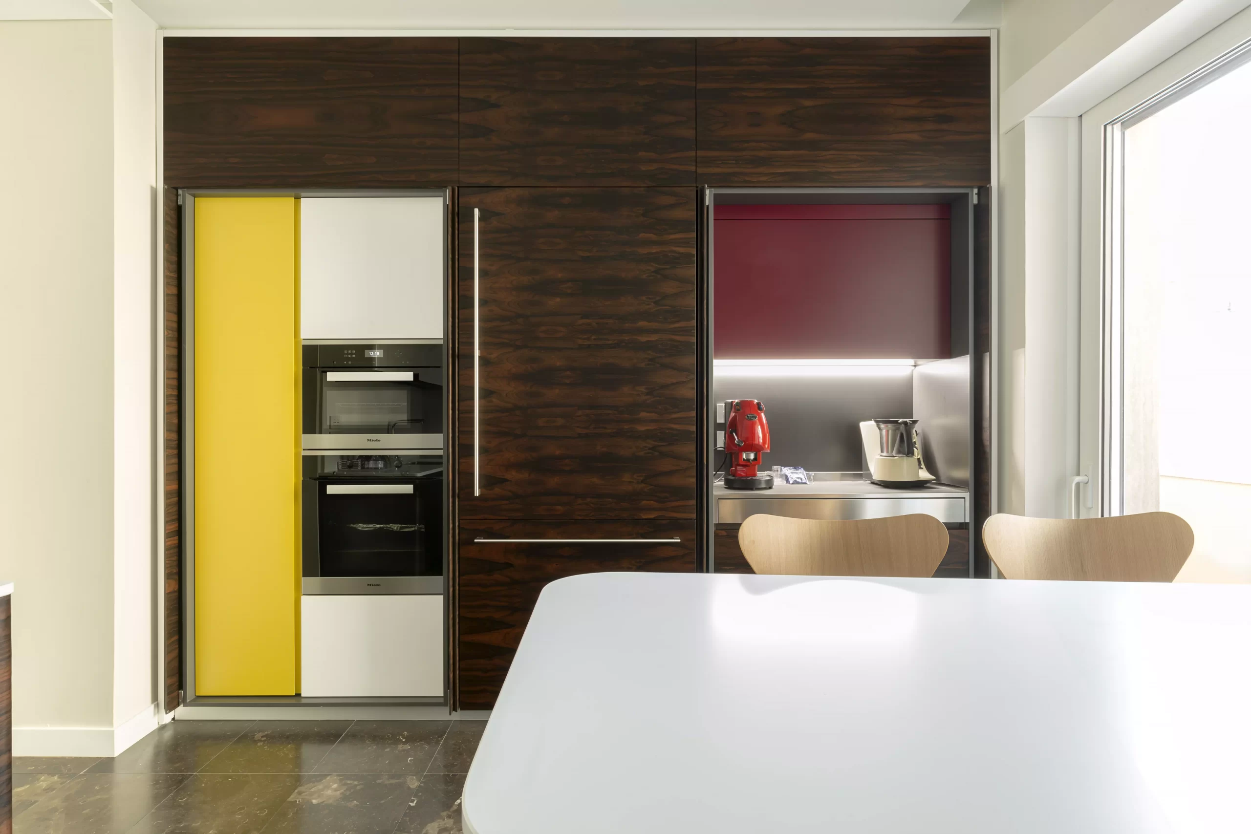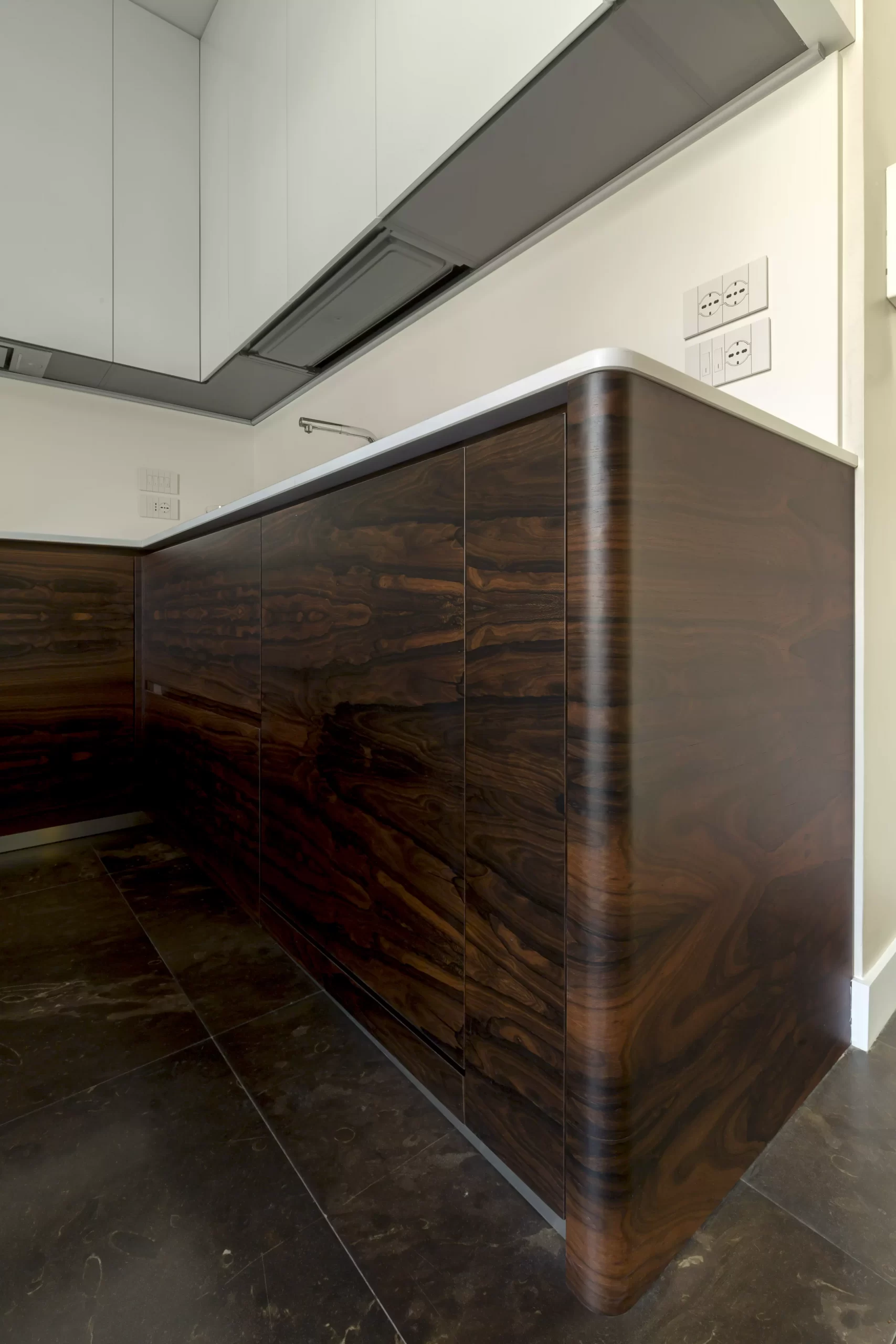 Il pregiato legno Ziricote del Belize, dalle venature movimentate e ariose, dona carattere all’ambiente creando un effetto chiaroscuro con i pensili a tutta altezza laccati bianchi opachi e il top in Lapitec®.