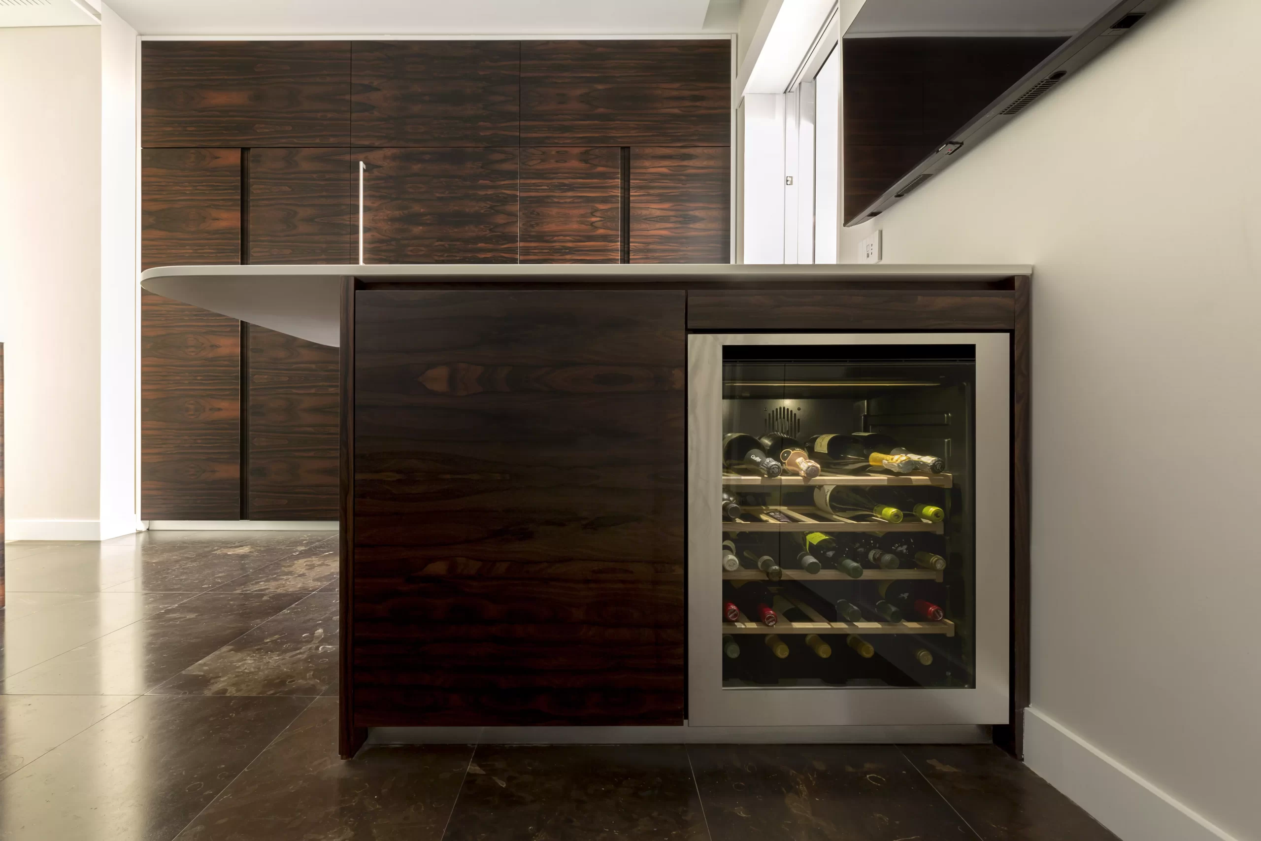 Top a sbalzo sagomato sovrapposto all’isola con cantina e frigorifero sotto-top.