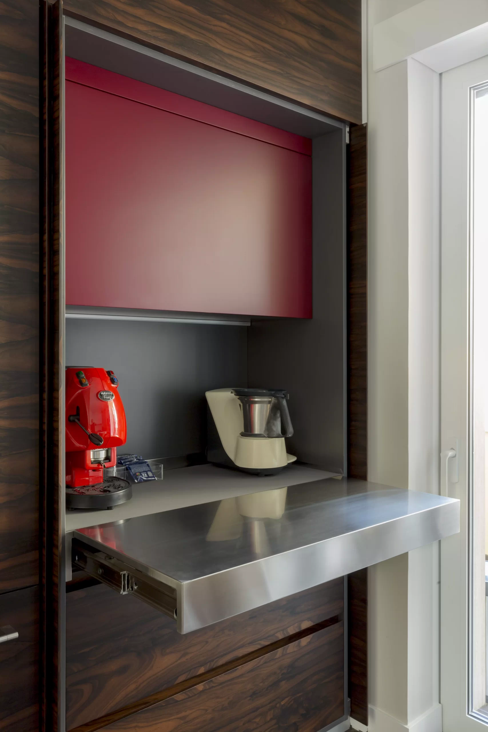 Tagliere estraibile in acciaio, led bar e ante roll-in.
