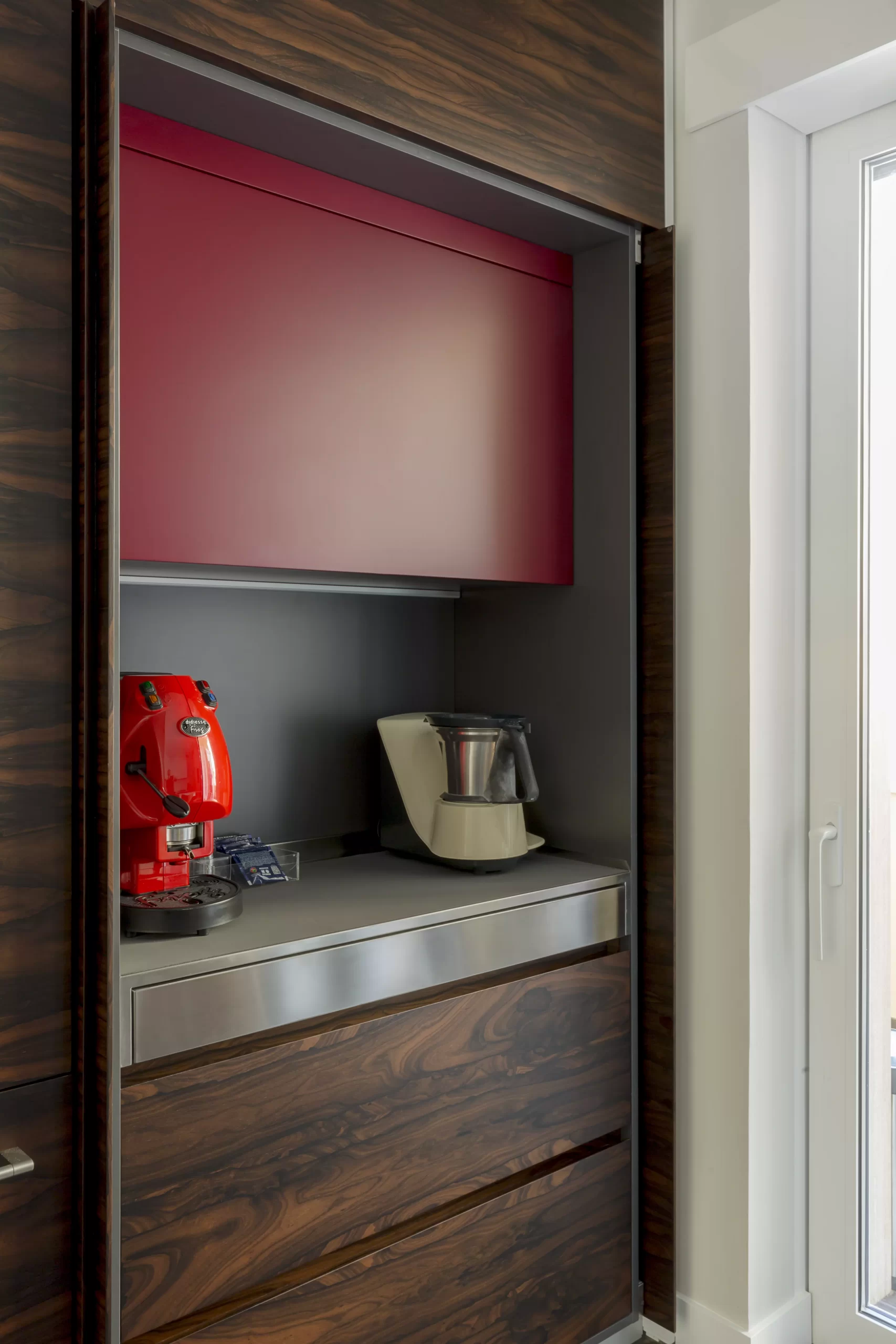 Impiallacciatura in biglia, top sagomato e cappa aspirante a scomparsa.
